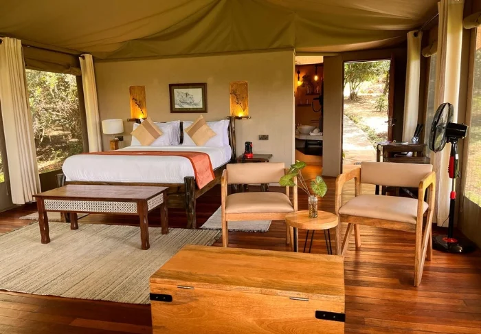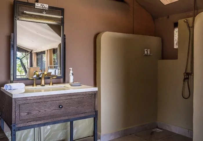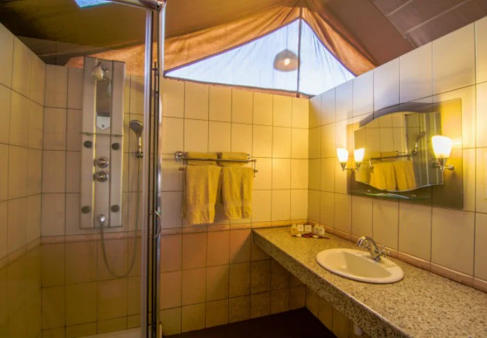 Her overnatter du i et af de 60 store og rummelige telte spredt ud over sletterne. Hvert telt har komfortable senge, et lille siddeområde, køleskab, te- og kaffefaciliteter samt deres egen lille veranda og privat badeværelse komplet med brusebad, håndvask og toilet.