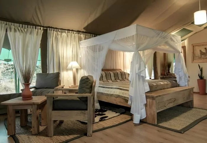 20 i alt – bestående af kanvas – som kan indrettes som single, dobbelt, triple, ja, sågar familietelt, hvis man rejser sammen som familie. De har alle fast gulv, eget badeværelse med varmt og koldt vand i bruseren, myggenet om sengene og store vinduer (bestående af myggenet, som man kan lukke til ved at rulle kanvas for), så du kan nyde den flotte udsigt til sletterne omkring dig. Hvert telt har en lille ”veranda” udenfor med stole og bord, hvorfra du kan nyde udsigten – og måske en god bog.