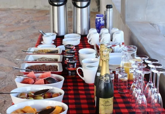 Komforten er til gengæld i top! Teltet er godt nok kanvas, men her er god plads til både borde, stole og den bløde seng og de er alle smukt dekorerede i naturfarver, så man ikke bliver ”forstyrret”. De har naturligvis alle eget bade”værelse” i den bagerste ende af teltet, og der er varmt vand i bruseren. Alle 12 telte har egen veranda med udsigt til sletterne.