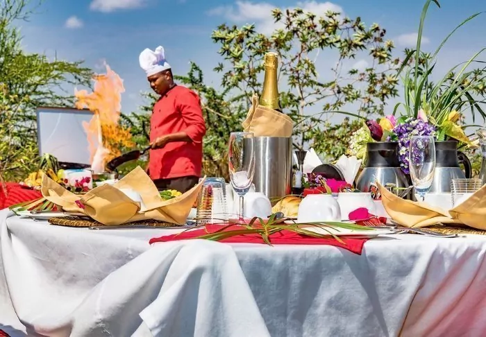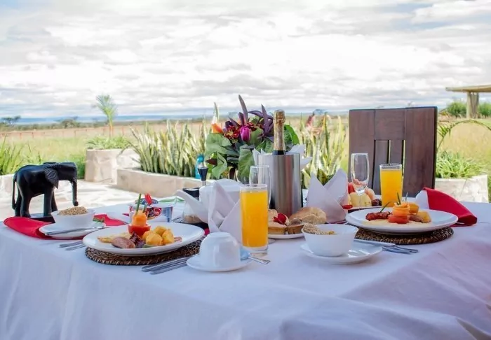 Måltiderne indtages i den delvis åbne restaurant med udsigt til Kilimanjaro.
