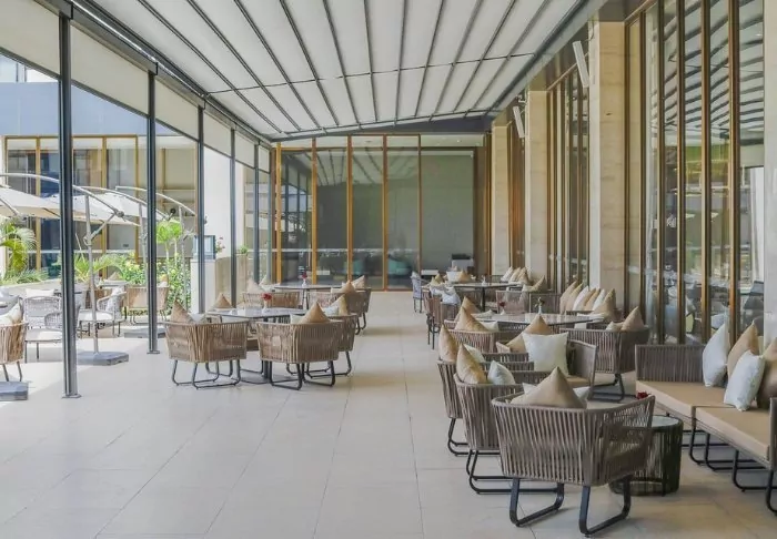 Hotellet er nærmest bygget som et lille kompleks, og i midten ligger en have med en pool for enden. Her er plads til solsenge, og ved siden af ligger en hyggelig bar. Hotellet har desuden 3 restauranter, loungeområde samt fitnessrum – og som det bedste af det hele, er der kun godt 15 minutters kørsel til lufthavnen, hvilket gør hotellet til det perfekte sted at overnatte på rejsen ud eller hjem.