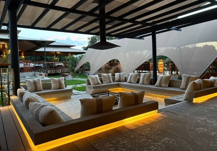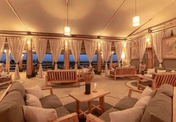 Bar og restaurant indbyder til hygge – her er bløde sofaer og små hyggekroge og er, som teltene, indrettet med god brug af naturlige materiale som træ og sten. Farverne er afdæmpede, så fokus holdes på naturen udenfor.