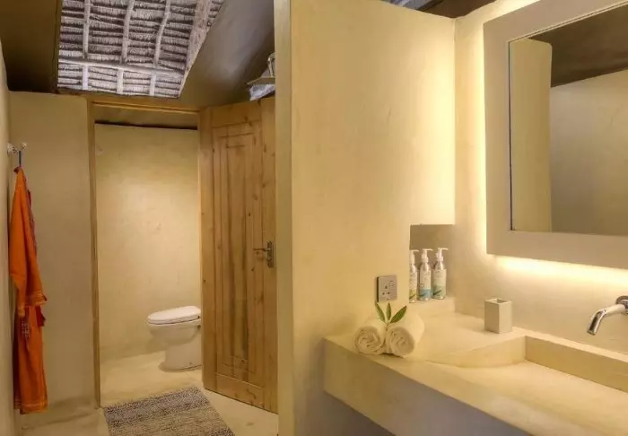 Teltene er bygget på cementplatforme, så de er hævet lidt fra jorden, og vægge og tag er af kanvas – dog er kanvastaget ekstra beskyttet af et karakteristisk afrikansk stråtag, som både skygger for sol og regn.
