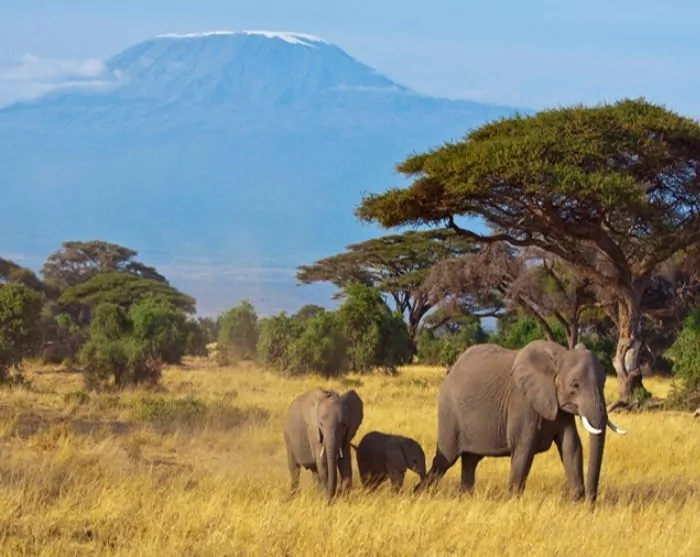Næsten overalt har du udsigt til Kilimanjaro, som godt nok ligger i Tanzania, men som formodentlig oftere er fotograferet fra Kenya-siden. Det er nemlig her i Amboseli, at du kan være heldig at få det kendte skud af elefanter, som i solnedgangen traver over det pandekageflade landskab for at komme ind i skovene ved foden af Kilimanjaro, hvor de tilbringer natten.
