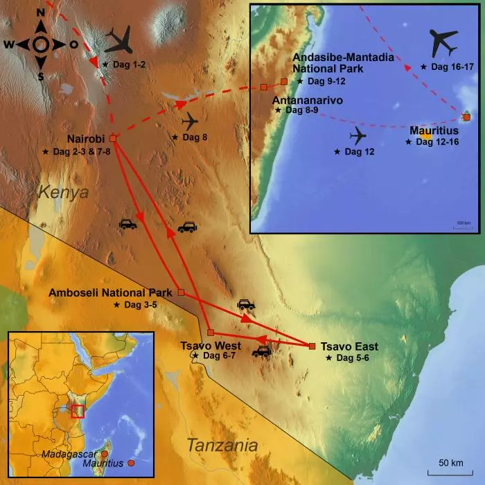 I Kenya oplever du næsehorn, elefanter og løver. I Madagaskar går du gennem regnskoven på udkig efter lemurer og kamæleoner, inden du slutter af med badeferie på eksotiske Mauritius.