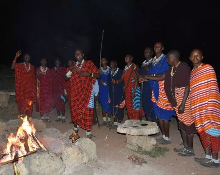 Når solen går ned, bliver du budt på solnedgangsdrink og mere sang og dans. Det er et magisk syn at se solen gå ned over dette landskab, og det er svært ikke at blive grebet af masaierne glæde og begynde at rokke lidt med på dansen.