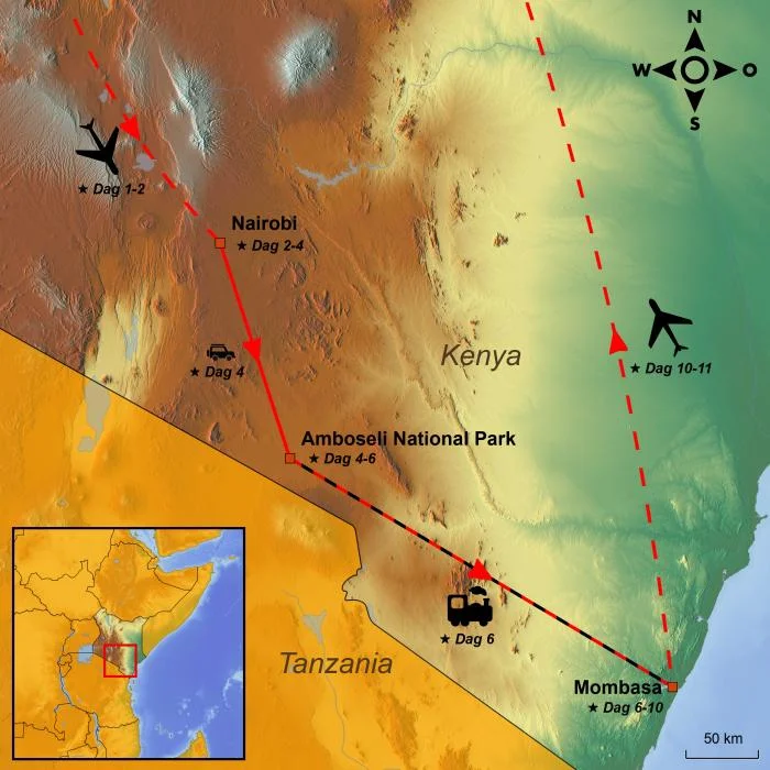 I dag er der afrejse fra valgte lufthavn, og rejsen går til Kenya i Østafrika med mellemlanding(er) undervejs.