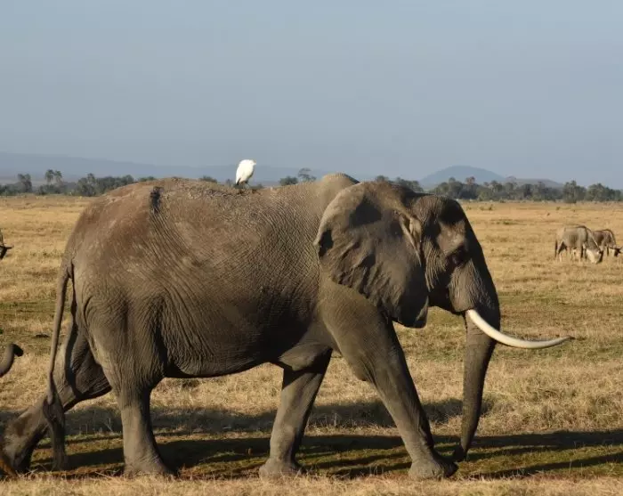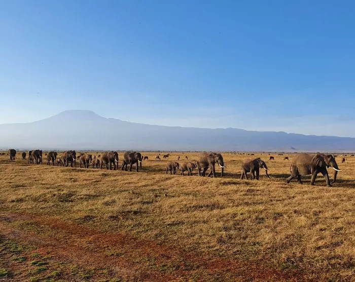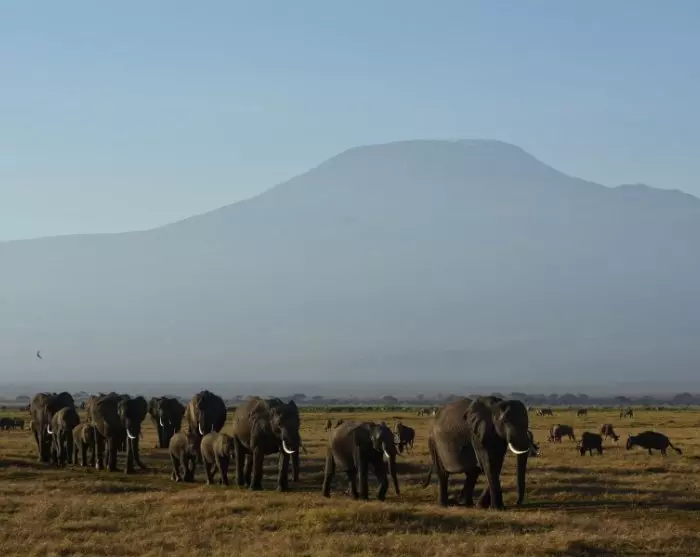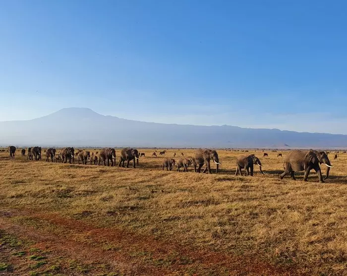 Næsten overalt har du udsigt til Kilimanjaro, som godt nok ligger i Tanzania, men som formodentlig oftere er fotograferet fra Kenya-siden. Det er nemlig her i Amboseli, at du kan være heldig at få det perfekte skud af elefanterne, som i solnedgangen traver over det pandekageflade landskab for at komme ind i skovene ved foden af Kilimanjaro, hvor de tilbringer natten. Flokkene af elefanter er store, og mange af elefanterne har gigantiske stødtænder!