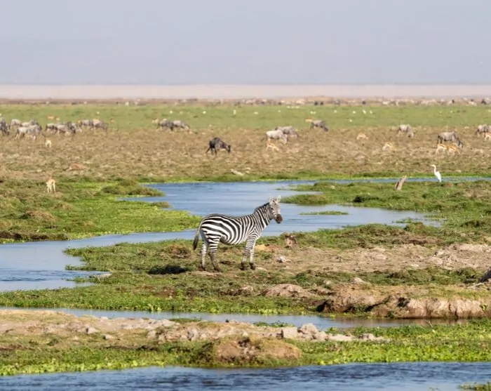 Den sparsomme bevoksning i Amboseli gør det lettere at finde de vilde dyr, og udover elefanter vil du se masser af zebraer, antiloper, giraffer – og sikkert også løver.