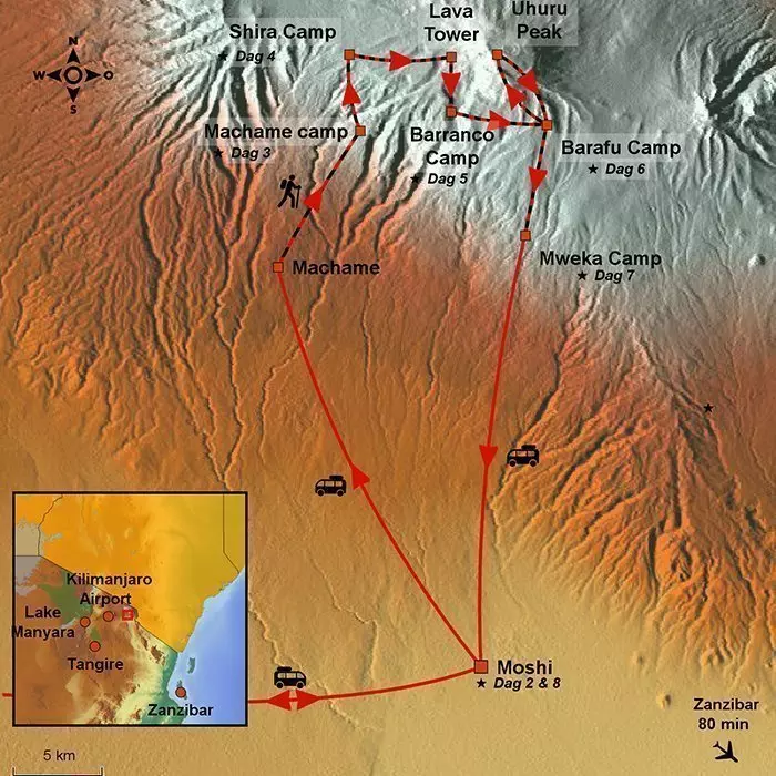 Efter morgenmaden forlader du Moshi og kører til landbyen Machame – en køretur på 50 min. Her møder du dit team af guider, kokke og bærere, som forbereder og pakker dit udstyr. Herefter går turen til Machame Gate, som er den sydvestlige indgang til Kilimanjaro Nationalpark. Her er der indtjekning og registrering, inden du begynder din vandring gennem regnskoven til toppen af Kilimanjaro. Kilimanjaro består af tre udslukte vulkaner; Kibo med det højeste punkt Uhuru (5.895 m.o.h.), Mawenzi (5.149 m.o.h.) og Shira (3.962 m.o.h.).