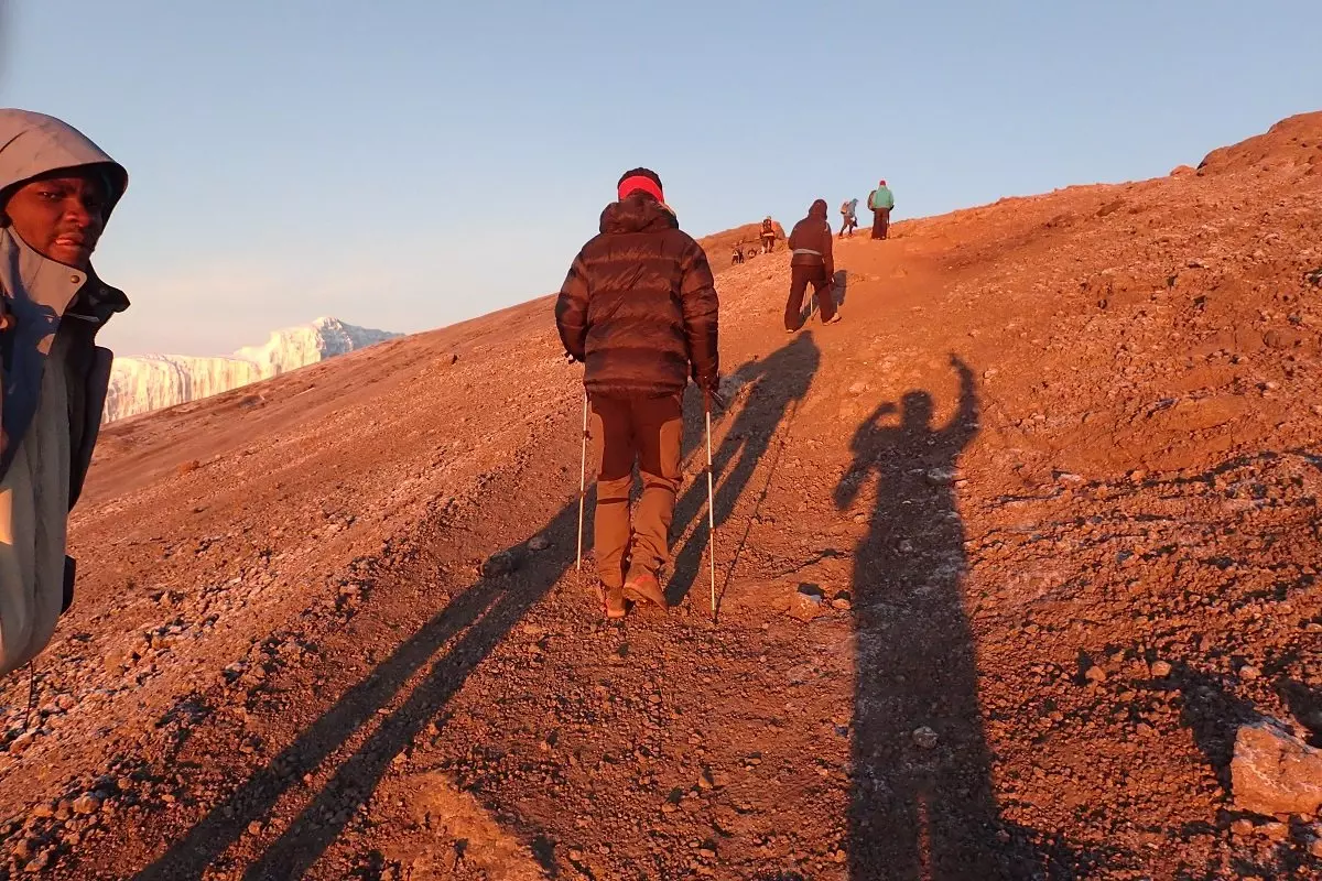 Efter en nat under den imponerende Great Barranco Wall og et solidt morgenmåltid klatrer du op ad den berygtede klippevæg. Noget som heldigvis er lettere end det ser ud til. På toppen under Heim gletsjeren, der hænger som kæmpe is-gardiner ud over massivet, folder Kilimanjaros skønhed sig ud på fantastisk vis.