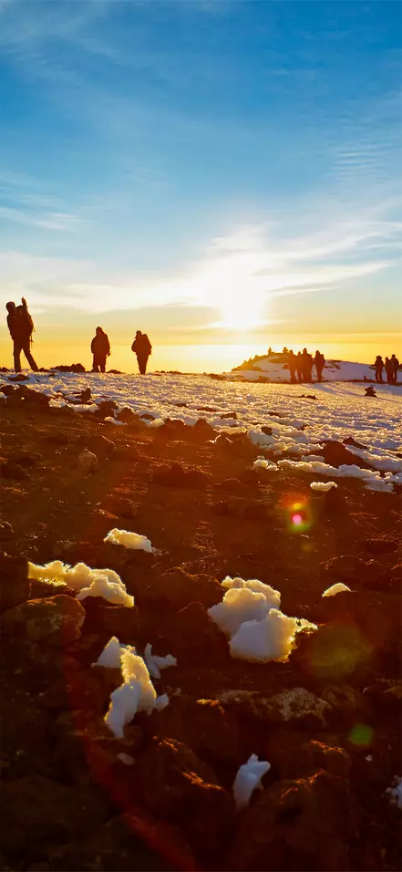 Omkring midnat står du op og du får serveret en snack, inden du i mørke starter den sidste opstigning til toppen. Det vanskelige terræn de ca. 6 timer frem til Stella Point er den største udfordring for de fleste. Målet er at nå Stella Point kort tid efter solopgang, så du kan nyde den rødglødende solopgang her. Hvilet bliver ikke langt, da det ellers bliver nærmest uoverkommeligt at komme i gang igen som følge af kulde og træthed. Du fortsætter langs kraterkanten og det sidste stykke er en jævn stigning. Afhængig af årstiden kan du risikere, at der er sne det sidste stykke til dit endelige mål, som er Uhuru Peak, toppen af Kilimanjaro og toppen af Afrika. Når du toppen 5.895 m.o.h., kan du klappe dig selv på skulderen, nyde den fantastiske udsigt og tage et selfie ved Uhuru Peak skiltet, som evigt minde.
