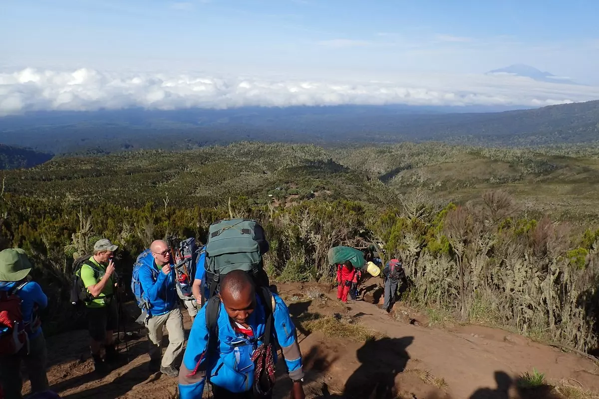 Herefter starter nedstigningen til Barafu Camp, det tager ca. 3 timer. Her får du et velfortjent, men kort hvil, inden du vandrer videre ned ad en stenet sti til Mweka Camp, hvor der venter dig en velfortjent nattesøvn. Lejren ligger i den øverste del af skoven, hvor der ofte er tåge og regn sidst på eftermiddagen. Højdepunktet er, at der her venter varmt vand og varm mad.