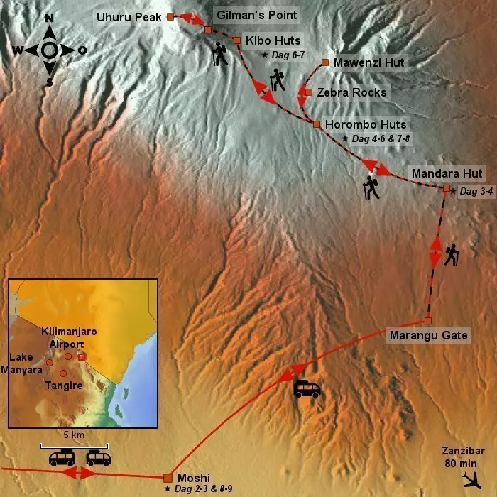 Højder: Kibo Huts: 4.695 m.o.h., Uhuru Peak: 5.895 m.o.h., Horombo Huts: 3.690 m.o.h.