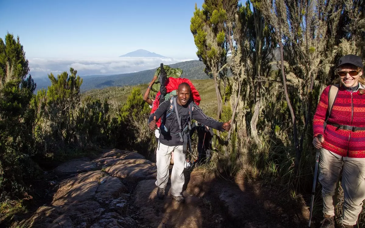 Marangu ruten er også kendt som Coca Cola ruten. Den starter ved Marangu Gate, som er den sydøstlige indgang til Kilimanjaro Nationalpark. Du vandrer langs smukke stier gennem skov og regnskov. Landskabet åbner sig og bliver til hedelandskab og de gigantiske senecios planter kommer til syne. Undervejs kan du nyde udsigten til Kibo og Mawenzis takkede bjergtinder. Vi har lagt en akklimatiseringsdag ind, så du bedre kan vænne dig til højderne og her kan du evt. bruge dagen på at opleve Mawenzi Tarn Hut eller Zebra Rocks. Hedelandskabet bliver langsomt afløst af det alpine ørkenlandskab, som forbinder Mawenzi og Kibo. Du vandrer forbi Gilman’s Point, hvorfra du kan nyde udsigten inden opstigningen til toppen, som foregår fra øst. Nedstigningen følger den sydøstlige side, hvor du har udsyn til Kilimanjaro fra de mange udsigtspunkter.