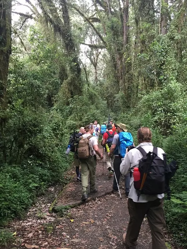 Efter morgenmaden forlader du Moshi og kører til Marangu Gate, som er den sydøstlige indgang til Kilimanjaro Nationalpark – en køretur på 45 min. Ved ankomst til Marangu Gate er der indtjekning og registrering, og det er også her du møder dit team af guider, kokke og bærere. Herfra starter bestigningen til toppen af Kilimanjaro. Du vandrer langs smukke stier gennem skov og regnskov med eukalyptus træer, forskellige fuglearter og måske er du også heldig at få et glimt af de sort/hvide colobus aber. I disse lave højder kan det være vådt og mudret, så det er vigtigt at have udstyret i orden – især fodtøjet. Ved ankomst til Mandara Hut kan du blot slappe af. Hvis du har mod på det og hvis der er stemning for det, kan du sammen med guiden og andre vandre en tur til Maundy Crater og udforske omgivelserne, mens kokkene tilbereder aftensmaden.