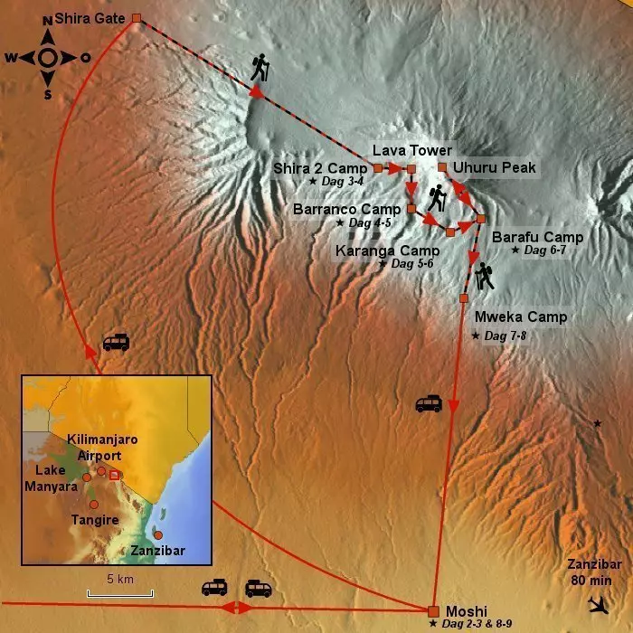 Du kører fra Moshi til Shira Gate, som er den vestlige indgang til Kilimanjaro Nationalpark. Ved ankomst til Shira Gate er der indtjekning og registrering, og det er også her du møder dit team af guider, kokke og bærere. Herfra starter bestigningen til toppen af Kilimanjaro. Kilimanjaro består af tre udslukte vulkaner; Kibo med det højeste punkt Uhuru (5.895 m.o.h.), Mawenzi (5.149 m.o.h.) og Shira (3.962 m.o.h.).