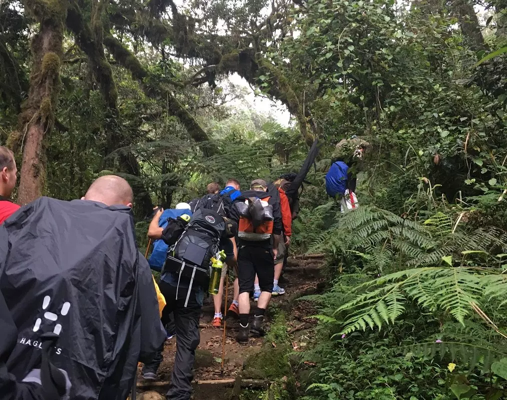 Ruten går langs smukke stier gennem regnskov og måske er du heldig at se nogle af skovens dyr. Efter regnskoven åbner hedelandskabet sig. Du ser bl.a. lyng, vilde blomster, de kæmpemæssige dendrosenecios planter og stenede stier. Undervejs har du en fantastisk udsigt til det enorme Kibo massiv. Bærerne går i forvejen, så dit telt står klar, når du ankommer til Shira 2 Camp.