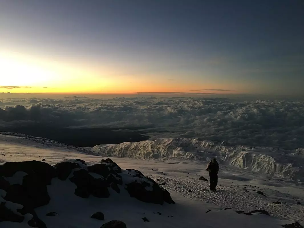 Omkring midnat bliver du vækket og efter en snack, starter den sidste opstigning til Uhuru Peak. At vandre i det vanskelige terræn i mørke, frem til solopgang, er den største udfordring for de fleste; målet er at nå Stella Point ved solopgang. Ved Stella Point gør du et stop for at nyde den smukke solopgang. Sørg for ikke at stoppe op for længe, da det vil blive nærmest uoverkommeligt at komme i gang igen som følge af kulde og træthed. Du fortsætter langs kraterkanten, og det sidste stykke til Uhuru Peak er en jævn stigning. Afhængig af årstiden kan der være sne det sidste stykke til Uhuru Peak, som er dit endelige mål, toppen af Kilimanjaro og toppen af Afrika. Når du toppen 5.895 m.o.h. kan du klappe dig selv på skulderen, nyde den fantastiske udsigt og tage et selfie ved Uhuru Peak skiltet, som evigt minde.