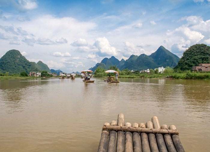 Tag på en stille og rolig rafting tur på Yulong-floden, som er den længste biflod til Li-floden, der løber fra Guilin til Yangshuo.