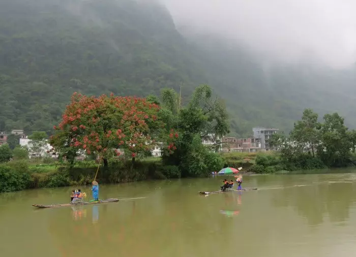 Herefter begynder eventyret gennem Yangshuos idylliske og maleriske natur. I løbet af den næste time flyder du forbi høje, asymmetriske kalkstensbjerge, skove, rismarker og små landsbysamfund. Du kan bl.a. opleve kvinder, der vasker tøj i floden, mænd der fisker og bøfler der er på arbejde ude i markerne.