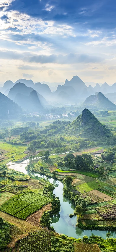 Yangshuo er omgivet af et nærmest poetisk landskab, der tager pusten fra enhver. Floden Li løber langs de høje kalkstensbjerge, der skyder op som prangende pukler i landskabet. Lidt uden for byen kan du opleve de flittige, lokale bønder, der plejer deres ris-, grøntsags- og blomstermarker.