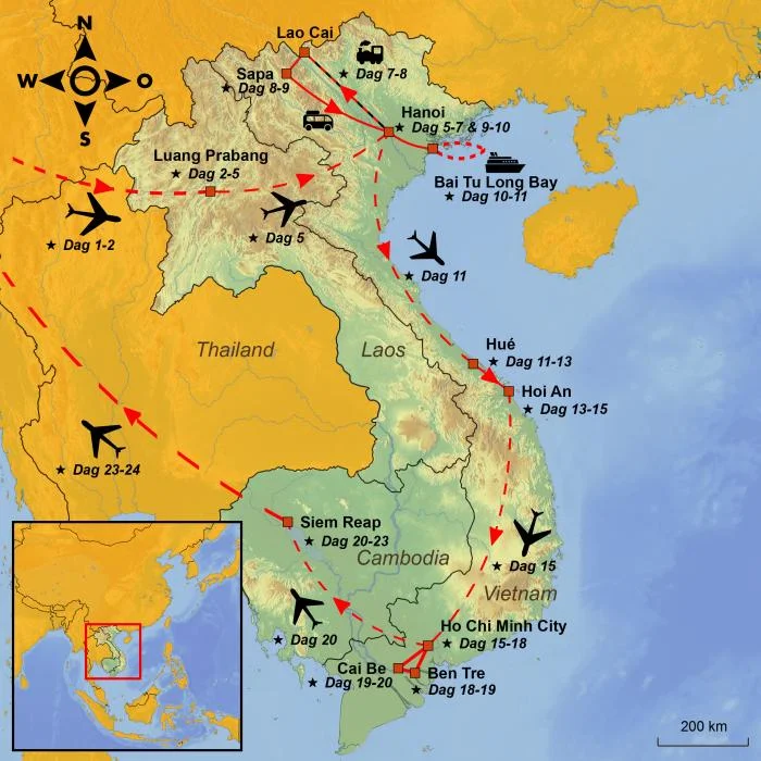 Rejsen starter i Laos i den tidligere kongeby Luang Prabang, som med sin afslappede atmosfære og velbevarede kolonistil er et højdepunkt i sig selv. Her kan du opleve munke i orange dragter indsamle almisse, nyde udsigten fra Phousi-bjerget, tage en dukkert ved det smukke Kuang Si-vandfald og gå på opdagelse blandt gadekøkkener og kunsthåndværk på byens natmarked.