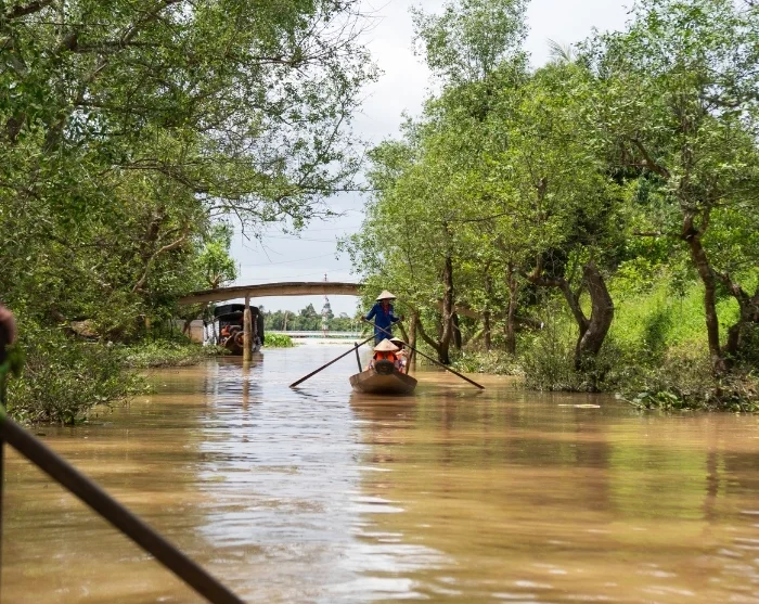 Efter ca. 2,5 times kørsel ankommer du til byen Cai Be, som er en charmerende flodby i Mekong-deltaet, kendt for sine frodige frugtplantager og autentiske landsbystemning. Her går du ombord i en båd og sejler ud på det frodige delta. Du besøger lokale værksteder, hvor dygtige kunsthåndværkere fremstiller produkter af kokos. Derefter fortsætter du i en lille sampan – en traditionel, håndroet træbåd – gennem Mekong-deltaets smalle, snørklede kanaler.