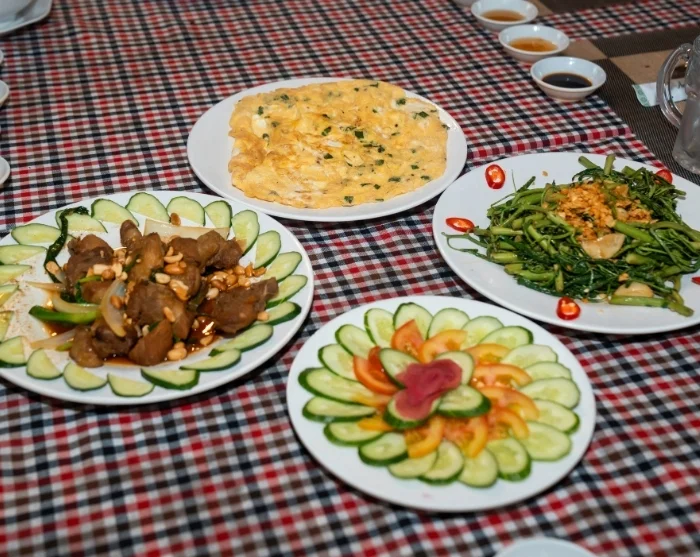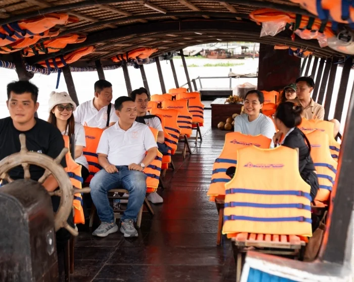 Sejlturen fører dig videre til en fredelig ø midt i Mekong-floden, hvor du nyder en vietnamesisk frokost tilberedt af friske, lokale råvarer, mens du er omgivet af grøn natur og flodens stille liv.
