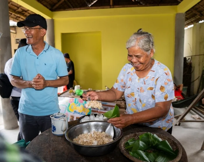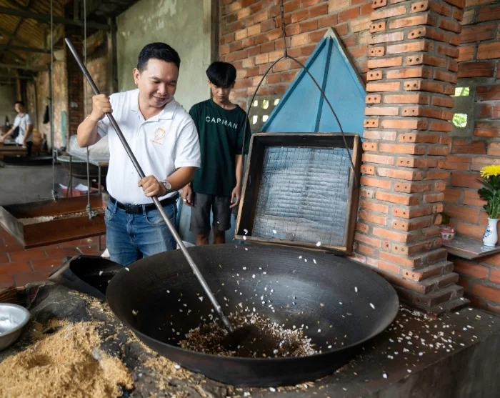 Tuktuk’en tager dig med gennem landsbyens rolige veje. Første stop er hos en lokal familie, hvor du smager com dep (grønne risflager) og ser, hvordan popris bliver fremstillet.