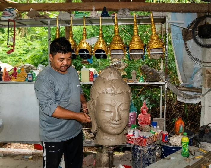 Turen fortsætter med et besøg hos en dygtig khmerkunstner, der skaber statuer og masker til områdets pagoder.