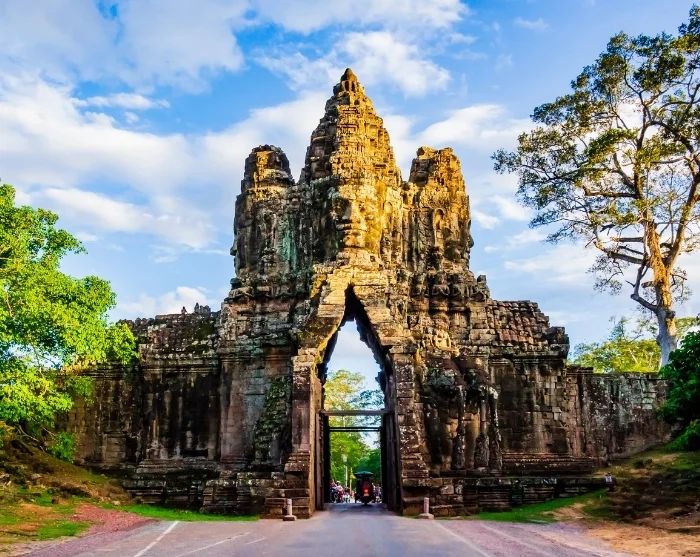 Dagen starter ved Sydporten til Angkor Thom, hvor statuer af gode og onde guder vogter indgangen. Herfra fortsætter du til det ikoniske Bayon-tempel, kendt for de hundreder af smilende ansigter, der pryder de høje tårne. De detaljerede basrelieffer er særligt imponerende og skildrer både hverdagslivet og de store slag mellem khmererne og de gamle thailændere.