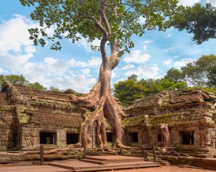 Efter en kort køretur når du frem til Ta Prohm, som adskiller sig fra de øvrige. Store, smukke træer har slået rod midt i ruinerne, så natur og sten nærmest er vokset sammen til én fascinerende helhed.