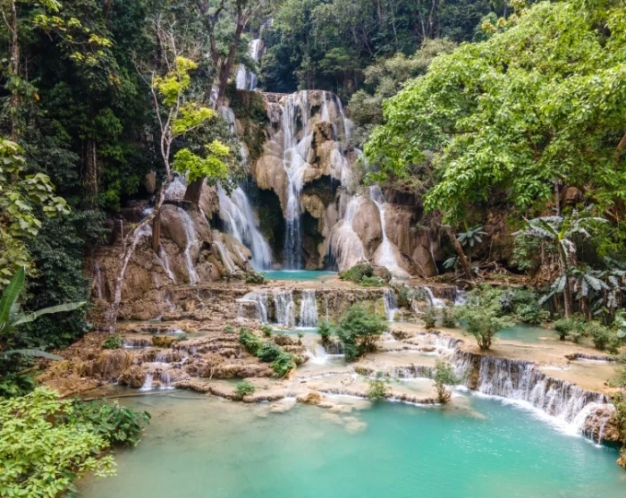 Efter en dejlig frokost går turen 30 km sydpå til Kuang Si-vandfaldet. Omgivet af frodig, tropisk jungle strømmer vandet i kaskader over tre niveauer ned ad en stejl bakkeside. Det højeste fald er på 60 meter, og på det laveste niveau kan du bade i det turkisblå, rolige vand.