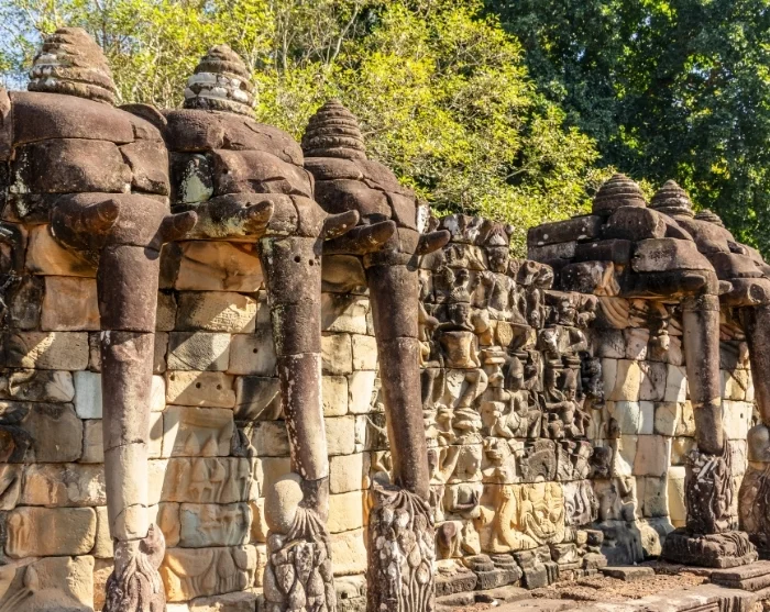 Oplev også Elefantterrassen hvor en lang række udskårne elefanthoveder danner en mur. Herfra kunne kong Jayavarman i sin tid overskue sin hær. Lige i nærheden ligger Terrassen for de Spedalske Konger med en statue af Yama, dødsguden i hinduistisk mytologi.