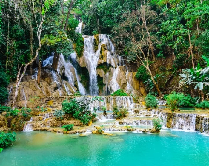 Efter en dejlig frokost går turen 30 km sydpå til Kuang Si-vandfaldet. Omgivet af frodig, tropisk jungle strømmer vandet i kaskader over tre niveauer ned ad en stejl bakkeside. Det højeste fald er på 60 meter, og på det laveste niveau kan du bade i det turkisblå, rolige vand.