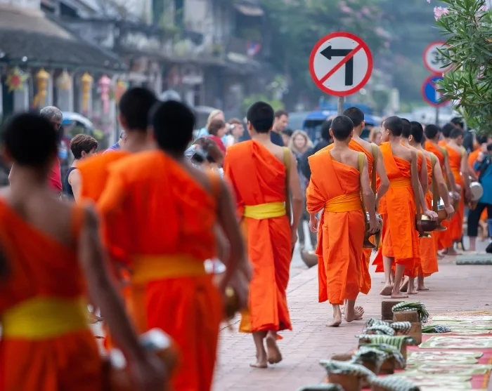 Hver morgen i de tidlige morgentimer udspiller der sig en helt særlig seance i Luang Prabang. Flere hundrede munke bevæger sig stille gennem gaderne for at samle almisser. Alle familier sender en repræsentant på gaden med mad eller drikkevarer, som bliver fordelt i munkenes skåle. Det er svært ikke at blive grebet af den respektfulde stilhed og store værdighed, som dette daglige ritual foregår med.
