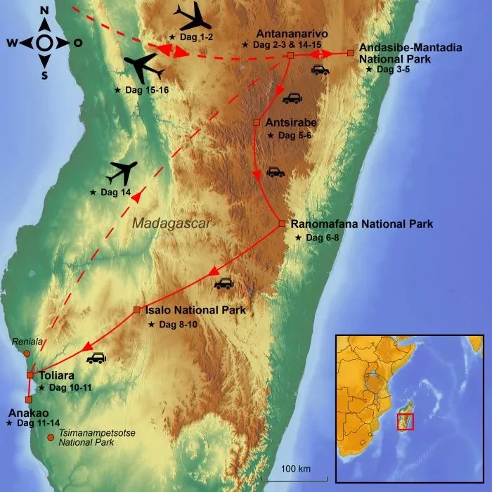 I dag er der afrejse fra valgte lufthavn. Rejsen går – med mellemlanding(er) undervejs – til Madagaskar, den store røde ø i Det Indiske Ocean.