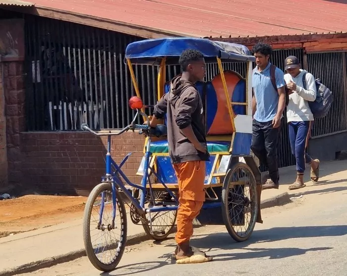 Vel fremme i Madagaskars tredjestørste by, Antsirabe, spiser du frokost, inden en rickshaw-tur rundt i byen venter. Det lokale navn for rickshaw er ”pousse pousse”.