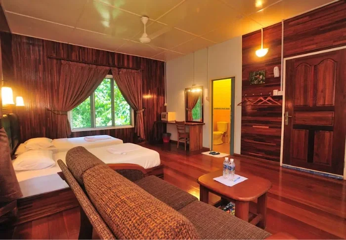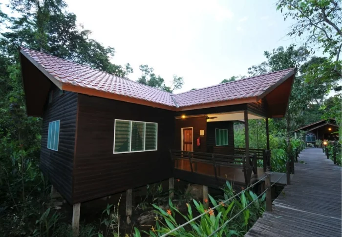 Lodgens 30 bungalows står alle på pæle og er forbundet af et hævet gangbrossystem, der smukt blender ind i de naturskønne omgivelser. Hver bungalow byder på loftventilator og eget badeværelse med bruser, varmt vand og miljøvenlige toiletartikler. Fra din private veranda kan du nyde regnskovens lyde, mens du spejder efter nogle af de langurer, der ofte lægger vejen forbi.