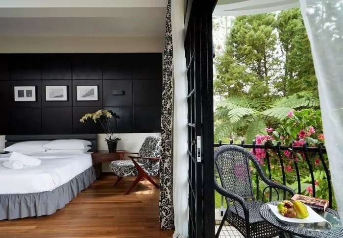 Resortets ydre er i britisk kolonitidsstil med hvide facader, sorte sprossede vinduer og fine balkoner pyntet med smukke blomster fra området.