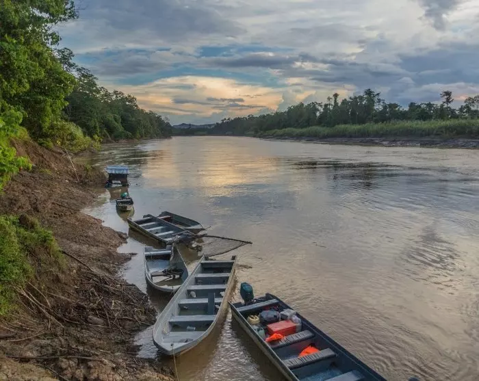 Som du stiger ombord på den lille båd, kan du læne dig tilbage og nyde regnskovens fredfyldte atmosfære, mens du sejler afsted i solopgangen. Landskabet omkring dig er som taget ud af et eventyr med scenerier, der kan få enhver til at tabe pusten. Flodens bugtende løb går gennem både åben og tæt regnskov, hvor brølende aber og syngende fugle skaber et unikt lydbillede.