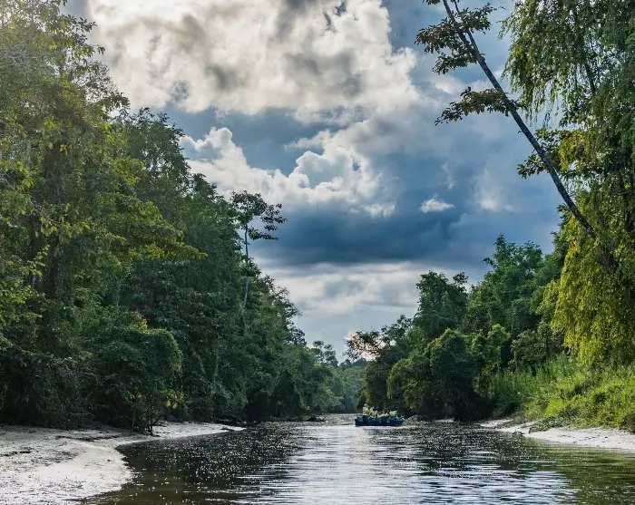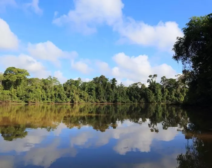 Som du stiger ombord på den lille båd, kan du læne dig tilbage og nyde regnskovens fredfyldte atmosfære, mens du sejler afsted i solopgangen. Landskabet omkring dig er som taget ud af et eventyr med scenerier, der kan få enhver til at tabe pusten. Flodens bugtende løb går gennem både åben og tæt regnskov, hvor brølende aber og syngende fugle skaber et unikt lydbillede.