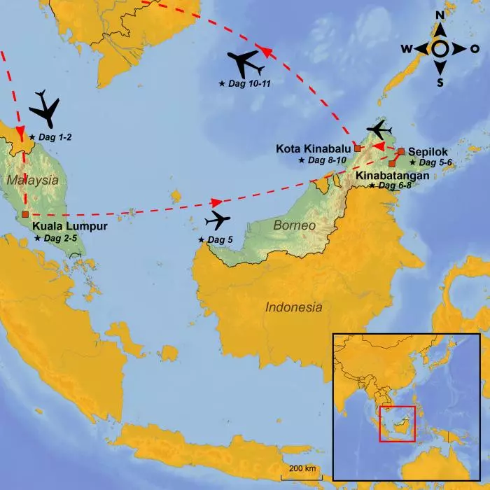 I dag fortsætter rejsen, når du forlader Kuala Lumpurs seværdigheder og flyver videre til verdens tredje største ø, Borneo. Øen er hovedsageligt indonesisk mod syd, mens det lille land Brunei ligger mellem de to malaysiske stater, Sabah og Sarawak, der ligger mod nord, og som byder på en overflod af spektakulære natur- og dyreoplevelser.