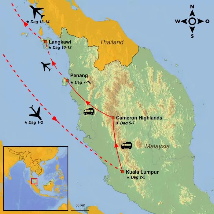 Rejsen viser dig Malaysias absolutte højdepunkter: fra Kuala Lumpurs høje puls og roen i Cameron Highlands til kulturen i George Town og Langkawis dejlige sandstrande.
