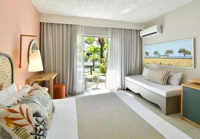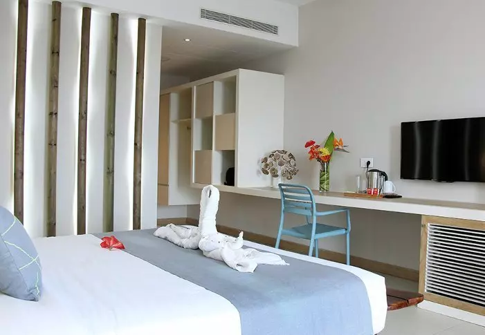 Comfortværelserne ligger længst væk fra stranden men til gengæld tætteste på poolen, og beachfront room ligger – som navnet næsten antyder – tættest på stranden. Derimellem finder man seaview-værelserne. Alle værelseskategorier har samme størrelse – det er kun beliggenheden, som adskiller dem. Værelserne i stueetagen har alle en lille terrasse, mens dem på første og anden sal har balkon.