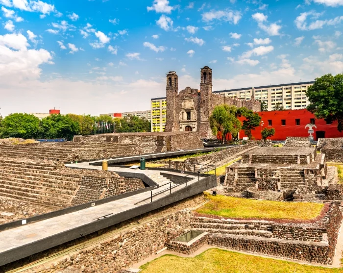 Første stop på turen er Plaza de las Tres Culturas, ”De 3 Kulturers Plads”, som repræsenterer Mexicos tre historiske perioder. Her findes rester af de præcolumbianske aztekiske ruiner, en spansk kirke fra kolonitiden samt de mexicanske mestizers moderne bygninger, som huser udenrigsministeriet.
