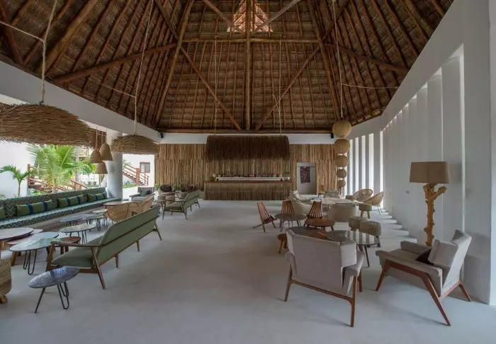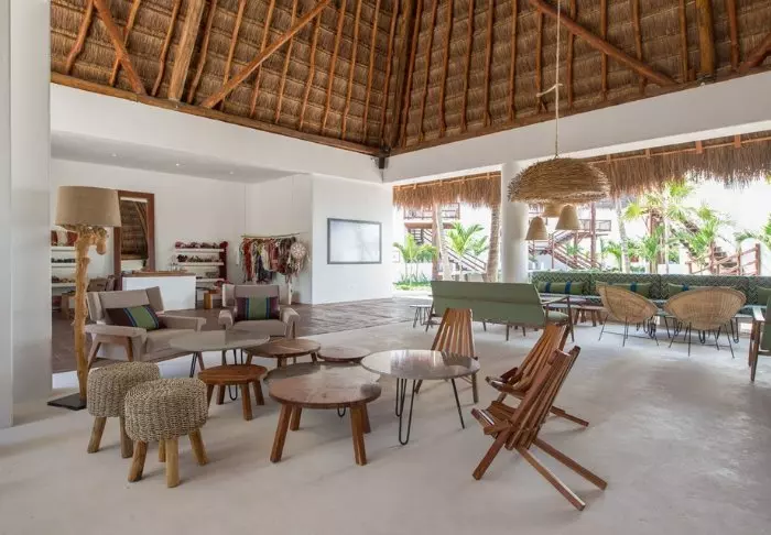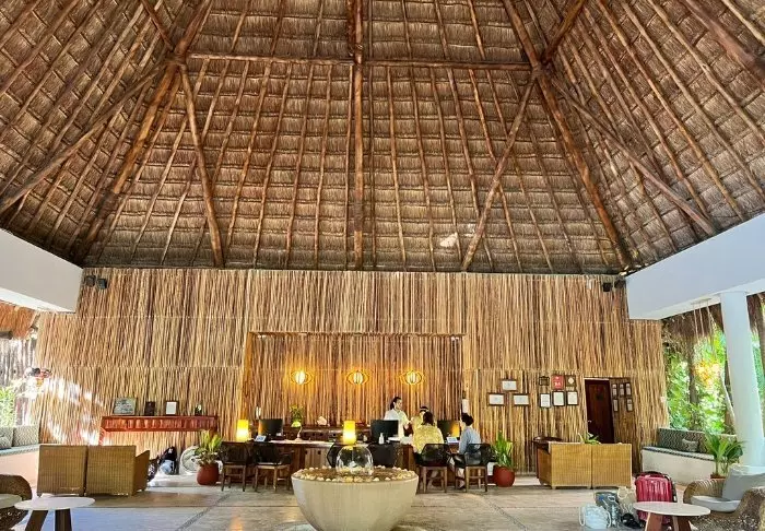 Både hotellets reception og restaurant er bygget under en høj, stråtækt palapa, som er en traditionel mexicansk byggestil, hvor man bruger naturlige materialer som træ, bambus og tørrede palmeblade. Udover at være superflotte, så giver de åbne sider og det luftige tag god ventilation, hvilket gør dem ideelle i varme og fugtige klimaer.