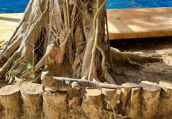 Værelserne ligger spredt ud i den frodige have, og de mange træer giver både en dejlig skygge for solen, men bidrager også til en ekstra naturoplevelse, fordi smukke eksotiske fugle kommer på besøg. Du kan også være heldig at se en doven varan eller leguan kravle ned fra et træ engang i mellem.