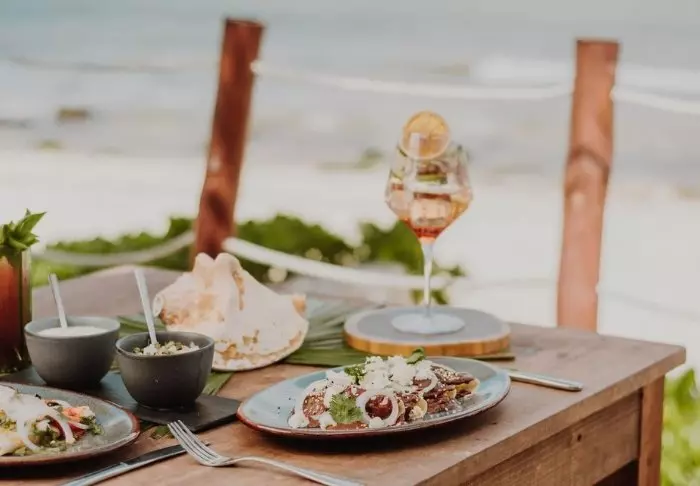 Hotellet har både en strandbar, hvor du kan nyde kolde drinks eller snacks, samt deres egen mexicanske open-air restaurant, hvor du sidder med fødderne i sandet og har udsigt over havet. Her serveres din inkluderede morgenmad og senere på dagen bliver menukortet skiftet til frokostretter. I højsæsonen har restauranten også åbent til aftensmad. Men ellers har du som gæst også mulighed for at nyde din aftensmad på en af de nærliggende restauranter, som både har fisk og skaldyr, mexicanske- og internationale retter på menukortet. Du kan også tage ind til Tulum by, hvis du ønsker et større udvalg af restauranter og barer.